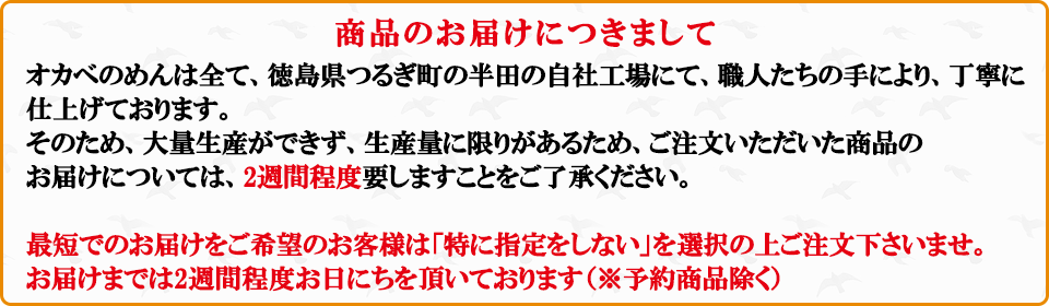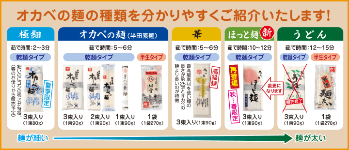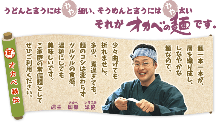 人気ランキング 【徳用】半田手延めん「オカベの麺」36人前【TS-40】乾麺タイプ ¥4,000(税込 ¥4,320) 【徳用箱】半田手延そば30人前【S-40】乾麺タイプ ¥3,500(税込 ¥3,780) 【新商品】オカベ お山の佃煮1袋(80g)【ZZ】 ¥700(税込 ¥756) 井上様田井様 いつもオカベの麺をご利用いただきましてあり がとうございます!オカベの麺は煮崩れしにくいので冬にもご利用いただけますが、これからの時期は冷たくしてもおいしくお召し上がり頂けますのでオススメです。どうぞこれからもよろしくお願いいたします。 この度は貴重なご意見をいただきましてありがとうございました。オカベのストレートつゆは甘めの味で、めんつゆとしてはもちろんですが、様々なお料理にかけていただけます。現在小袋入りのみのお取り扱いとなりますが、今後のご参考にさせていただきたいと思います。 乾麺タイプ 半生タイプ 高級乾麺 乾麺タイプ 乾麺タイプ 半生タイプ 乾麺タイプ 半生タイプ 乾麺タイプ ストレート麺つゆ 濃縮麺つゆ ゆずポン酢 しいたけ佃煮 あゆの姿煮 鳴門金時(なるときんとき) そば米 ぜんまい 松茸 土佐文旦 999 円以下 1,000 円〜2,999 円 3,000 円〜4,999 円 5,000 円以上 オカベの麺とは 麺へのこだわり 美味しいお召し上がり方 すべての商品を見る お買い物ガイド よくある質問 お客様の声 おすすめレシピ 田舎日記 ポイントについて 初めてご購入の方 ID・パスワードをお忘れの方 複数注文の方法 特定商取引法に基づく表示 個人情報保護方針 会社案内 お問い合わせ