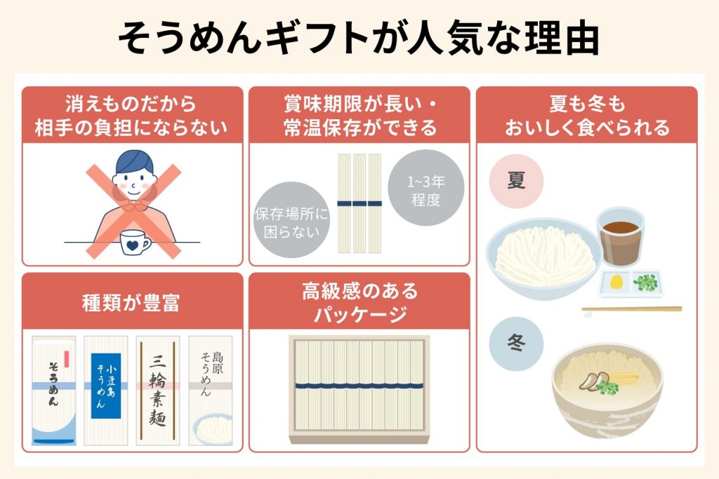 そうめんは、縁起が良く日持ちもする食べ物のため、ギフトとして高い人気があります。夏に食べられるイメージが強いものの、アレンジ次第で一年中おいしくいただける点も贈り物として選びやすいポイントです。