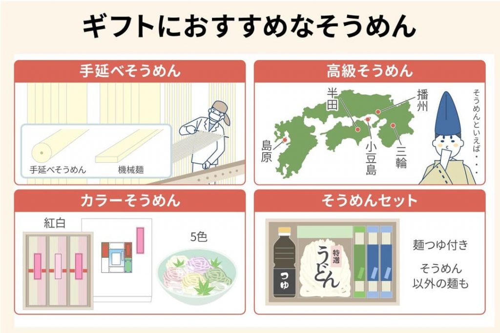 ギフト用のそうめんは定番品以外に、以下のような種類から選ぶのもおすすめです。