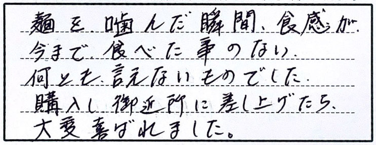 コシがあり食べ応えがあり美味しくいただきました。差し上げた方々にも大変好評で、ご自身でも注文するとおっしゃっていただき大変嬉しかったです。