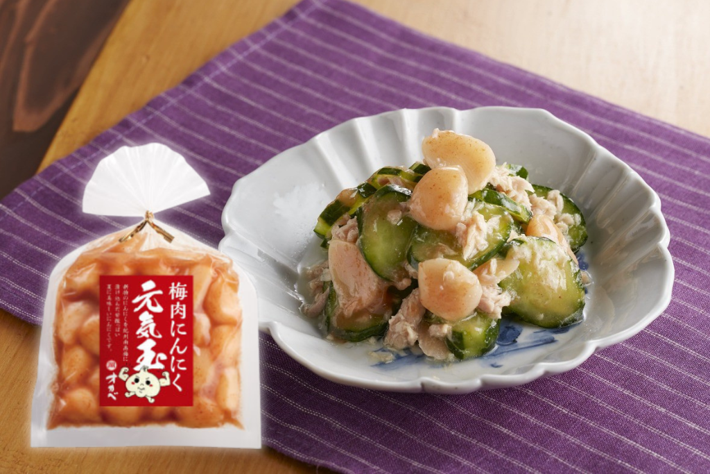 香川県産の新物にんにくを収穫し、半年間塩漬けにした後、紀州の南高梅に漬け込みました。しっかりと味がしみ込んで、シャキシャキとした食感です。梅肉の甘酸っぱさもくせになります。きゅうりやオクラなど、夏野菜と和えるだけでサッパリと食べやすい一品に。