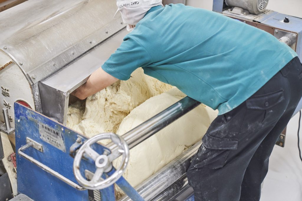 オカベがこだわるのが、多加水製法。その名の通り、練りの段階で、水をギリギリまで、多く加える製法で、これにより、しなやかさとソフトな食感が生まれます。その日の気温と湿度により麺の状態が変わるため、職人の経験と感が非常に重要になります。