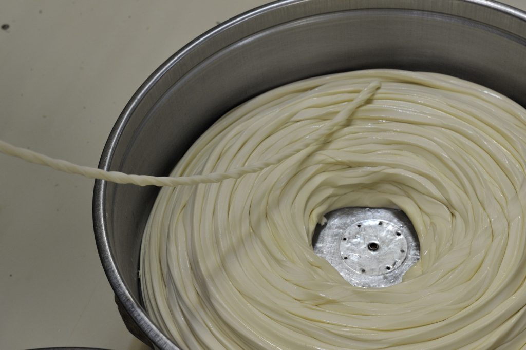 強い弾力を作ります。麺の帯は、3×3×2=18の工程を踏むことで麺は18層を織りなし、パイシートのように、麺に層を作ることで、ソフトな食感を生みます。 ワラをなうように、ひねって、ねじって、延ばすことで、オカベならではのコシの強さを生み出します。練りの工程後の平べったい麺の帯の大きさは、最終、1.3㎜から1.6㎜の太さになるのです。