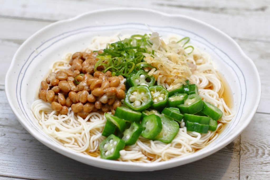 ネバネバ食材代表の納豆は、夏バテ気味のときでも食べやすく、タンパク質も豊富。麺つゆとの相性も良く、混ぜるだけの手軽さも魅力です。同じくネバネバ食材のオクラやとろろなどと一緒にトッピングするのも◎