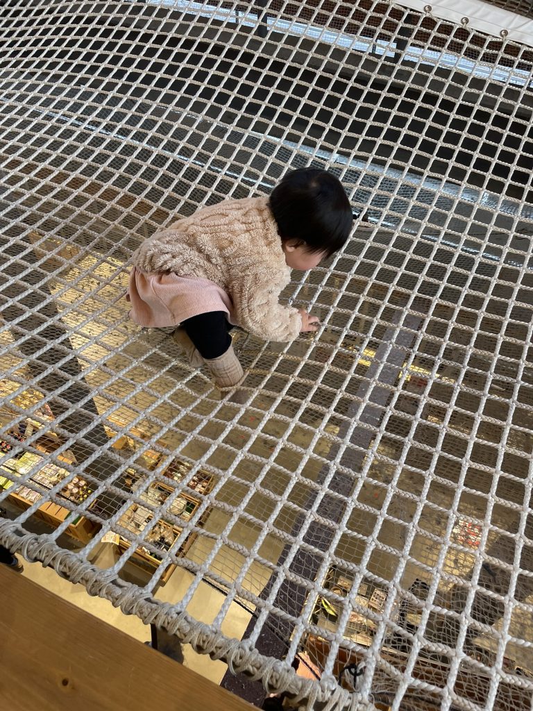 帰る前に娘を怖がらせようとアスレチックネットの上に乗せてみましたが全然怖がりませんでした。