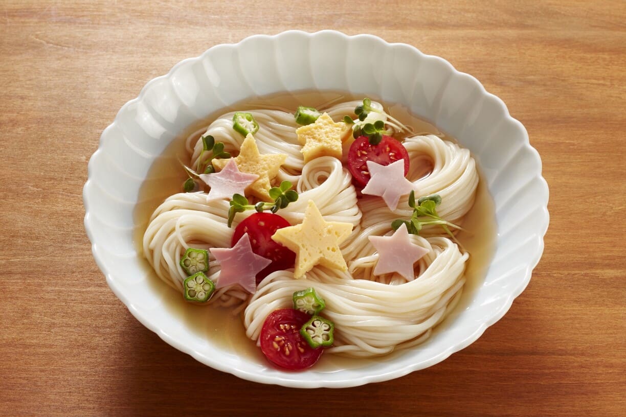 7月7日七夕はそうめんの日!茹でたそうめんを天の川に見立てた七夕そうめんはいかがですか。卵やハムを星形にくり抜いて飾り付ければ天の川に輝く星のよう☆彡