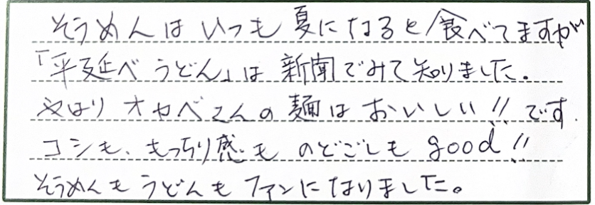 初めて賞味させていただいてからオカベの麺の虜になりました。特に乾麺でこしがあるのには驚きです。平延べうどんの大ファンで冬季だけでなく一年中食べたいくらいです。