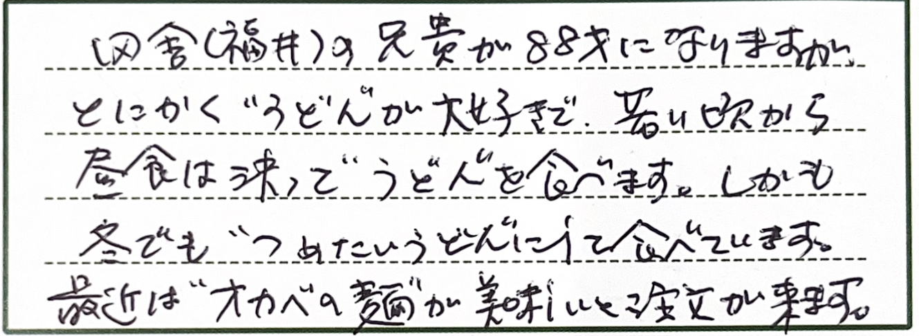 とてもこしがあって、のどごしがよく、美味しかったです。冷たくても、温かくてもいい。友達に勧めたいお品だと思います。