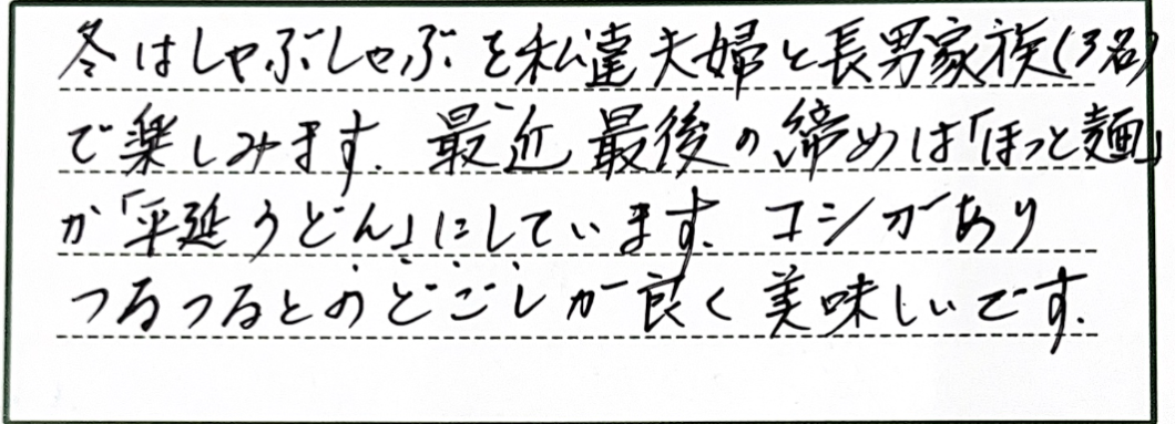 オカベの麺で感動し、第二弾として平延べうどんを試してみました。一番良かったのは、3歳の子供の食いつきが凄く良く、家族全員で楽しめた事です。次回は、既に購入済みの極細めんを楽しみたいと思います。