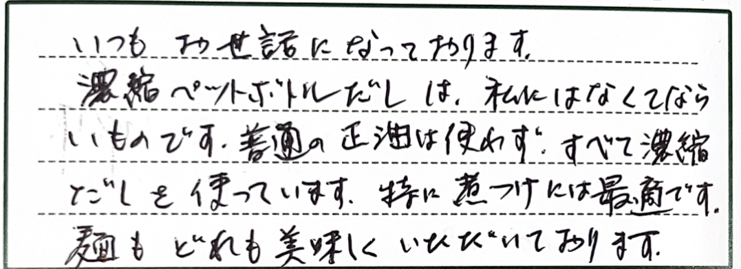 今回、そうめんつゆを購入させて頂きました。おかべの素麺にピッタリなお味で、家族みんな美味しいと、大満足です。