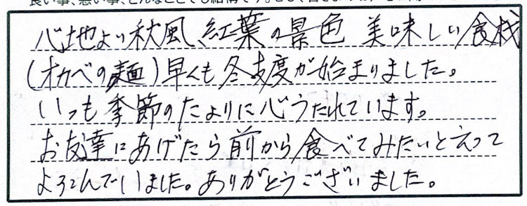 滅多に麺を食べる習慣がなく、素麺やそばを年に数回食べる程度ですが、たまたま賄いで御社の麺を頂きとても美味しく、その場で調べて、家族にもと思い少し多めに購入しました。美味しすぎてもう素麺は食べれないなと家族で話しております。