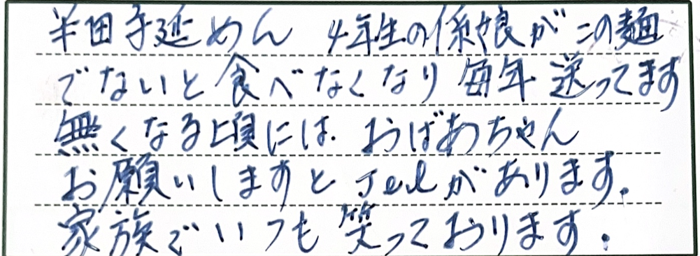 家族全員オカベの大ファンです。3歳の孫はオカベのめんめん♪と言って茹でてあげると1人で一束以上食べます。 先日長男一家にもオカベ麺を振る舞ったところ美味しかったようで、5年生の孫が何を良い?と聞くと毎回オカベの麺と答えるそうで…