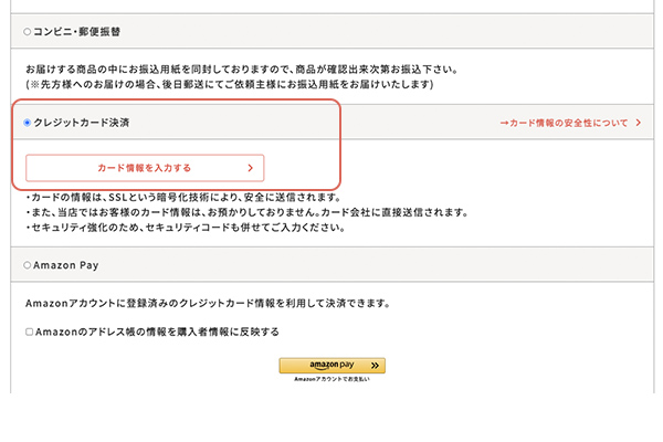クレジットカード決済/Amazon Pay/コンビニ・郵便振込/代金引換よりお支払い方法をご選択ください。