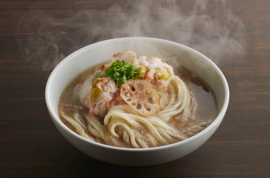 れんこんの旨みをぎゅっと閉じ込めたまんじゅうを添えた、冬にうれしいあったかうどん。