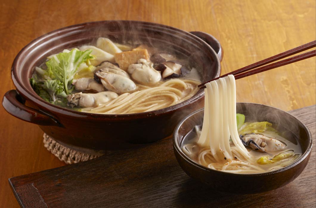 広島県の人気郷土料理をオカベ風にアレンジ♪みそが基調のスープに旬の牡蠣やお野菜の旨味が溶け出してたまらないおいしさ!平たい平延べうどんがよく合います◎