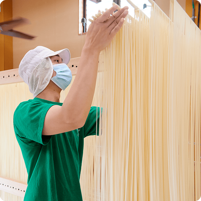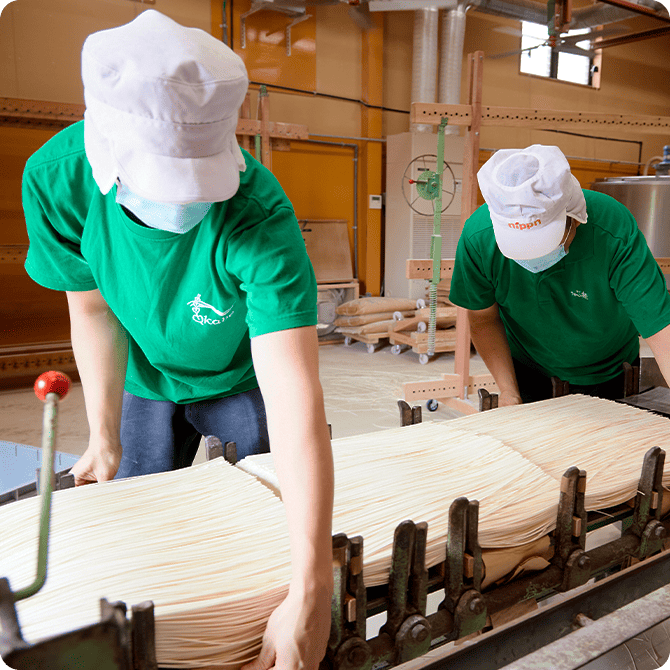 オカベでは、1つの麺を30時間かけて製造しています。私が関わる麺を練る作業は、その日の麺の状態が決まる大事な工程です。日によって違う温度や湿度に「練り加減」や「温度調節」を合わせていかなくてはいけません。工場長やチームメンバーと常に話し合いながら、最適な調整を行っています。こうして製造した麺を乾燥させて翌日取り込んだときに、綺麗にできあがっているのを見るとすごく嬉しいですね。