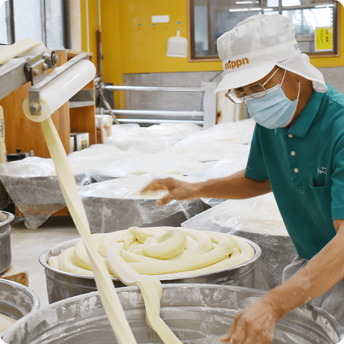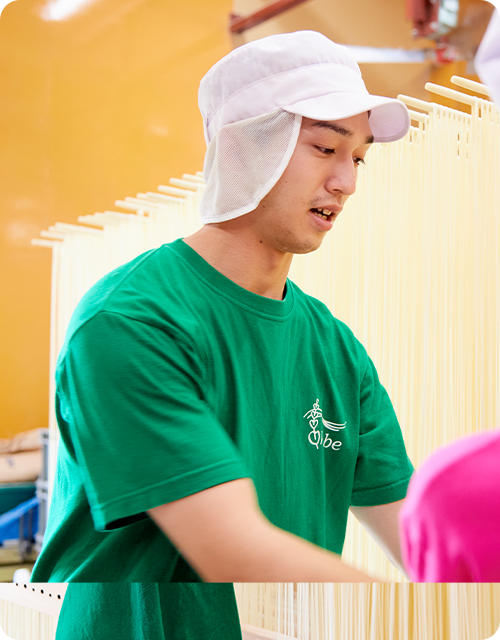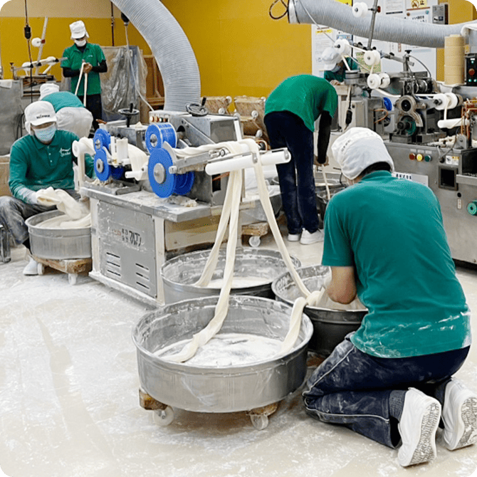 以前、私がつくった麺を食べた知人から「おいしい」と褒めてもらえたときは、すごく嬉しかったですね。製麺工場は朝が早いので、慣れるまでは大変かもしれませんが、私たちがしっかりサポートしていきますし、マニュアルもあるので安心して応募してきてください。シニアの方でも体力に自信がある方は大歓迎です。