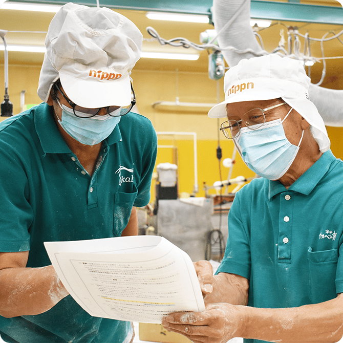 また、私が勤務を始めたころはそうめんの太さなどを経験や感覚で製造していたこともありました。ですが、新しい人が増えていくにつれて指導する機会が増えていき、私の経験や感覚をしっかりと伝えるには、マニュアルが必要だと思ったんです。そこで、麺の太さなどを数値化して製麺マニュアルをつくりました。私が作成した製麺マニュアルを新しく入社してきた人が見て、麺のつくり方を学び、分かりやすいと言ってくれているのを聞くと、つくって良かったとやりがいを感じます。