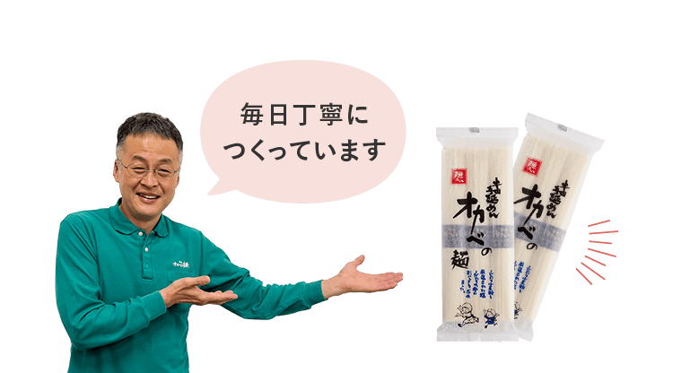 麺づくりは一見とてもシンプルな作業に見えますが、奥深いのです。お客さまに喜んでいただけるよう、1本1本丁寧に手間暇かけてつくっています。