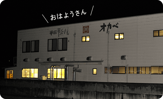 おいしい麺をつくる秘訣!オカベでは、麺を休ませながら熟成させるため、毎朝3時から準備して製造を開始します。外は真っ暗で、冬などは寒さも厳しい時間ですが、この早い時間こそが、おいしい麺をつくるために重要なのです。