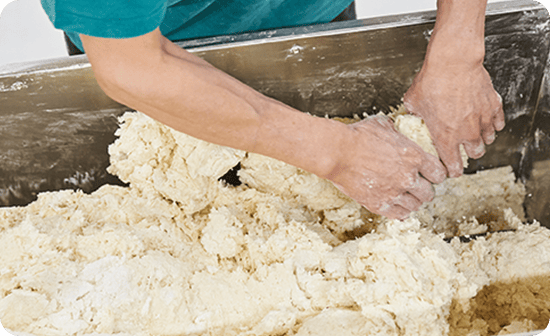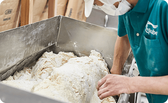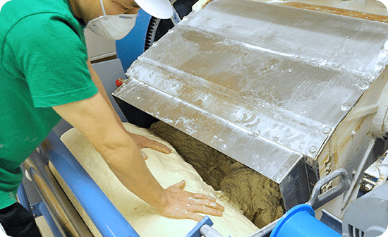 「オモチ状」の柔らかさに厳選された小麦粉・塩・水を混ぜ合わせる「ねり」作業から始まります。