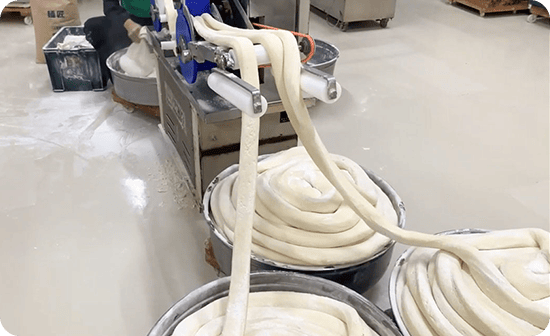 麺圧機に入れ、ローリングしながらゆっくりと圧縮していきます。