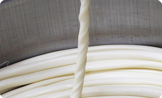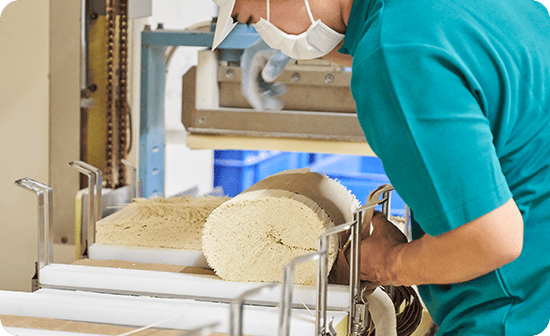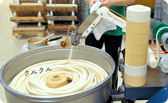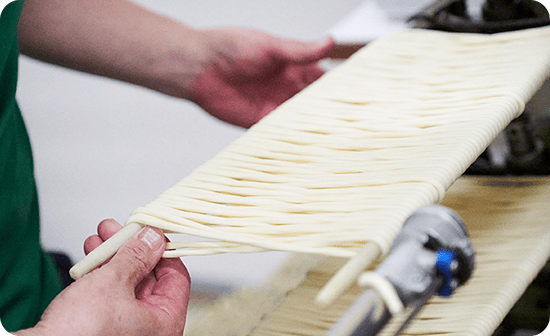 「手打ち麺」と「手延べ麺」の違いは、「手打ち麺」は麺の組織が網目状ですが、「手延べ麺」はらせん状になっています。「手延べ麺」は自動巻機を使い「ねじり」ながらじっくりと細く仕上げています。
