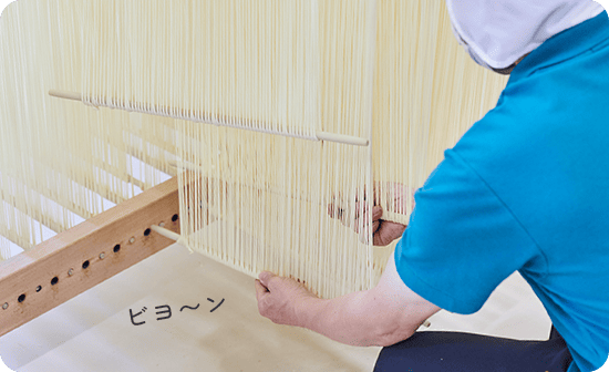 2時間ほど麺を休ませ、2本の棒にかかった麺を上下に一定の長さで延ばします。これは次の「旗かけ」で延びやすくするために行います。この後また麺を休ませます。