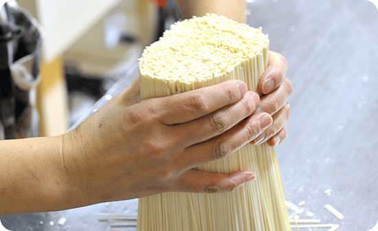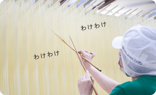 麺同士がくっつかないように、丁寧に「はし」を入れ、湿度などを調整しながら、翌日の午前8時頃まで乾燥し、約30時間かけてようやく完成です。ゆっくりと乾燥させることで表面がきめ細かになり、麺の中心部から熟成が進み、喉越しの良い麺ができます。