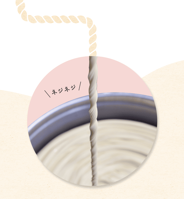 ねじりながら延ばし、そしてひねりながら延ばすことで簡単に切れないコシの強い麺ができ上がります。